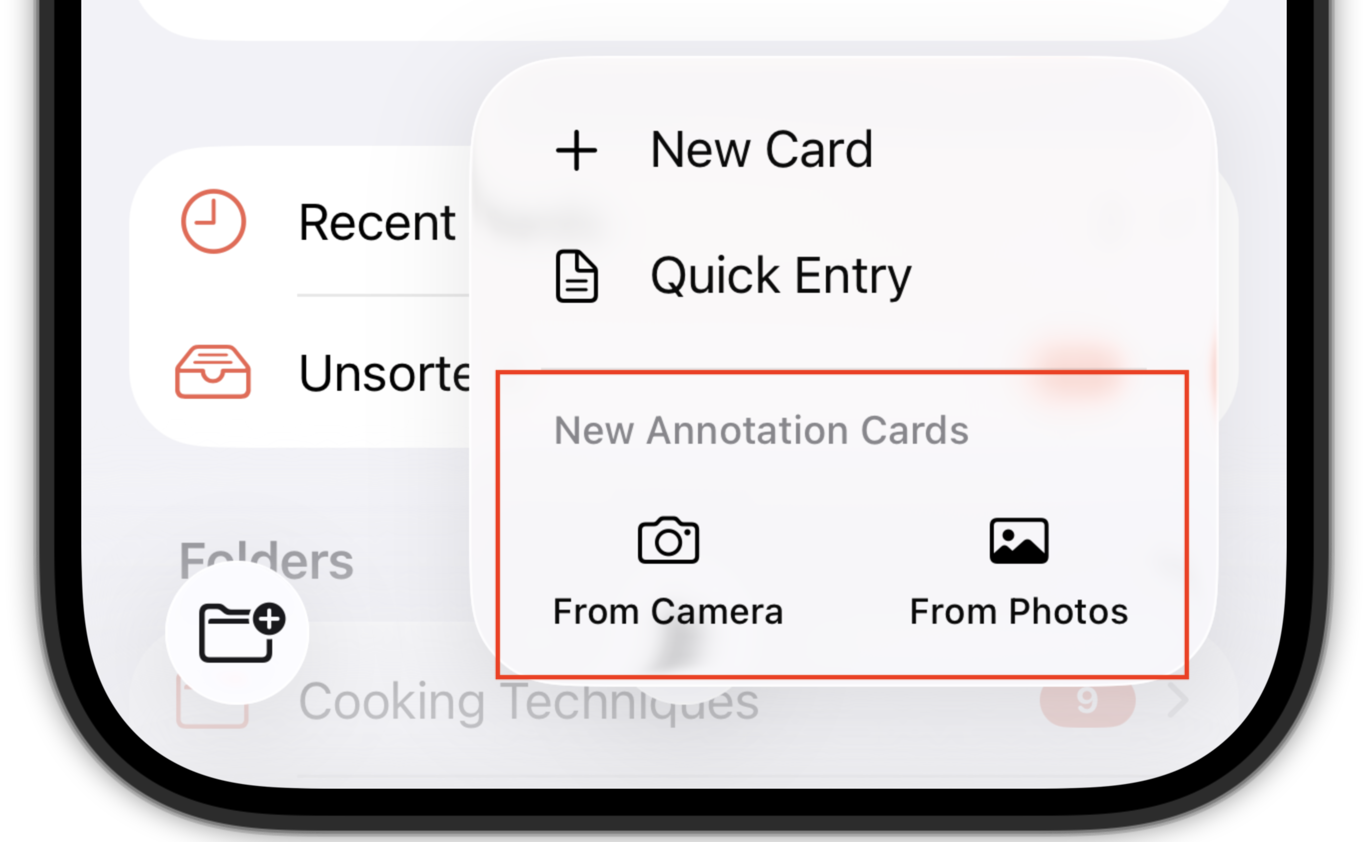 On iPhone & iPad Tap on the + menu, then on From Photos or From Camera, both under New Annotation Cards.
