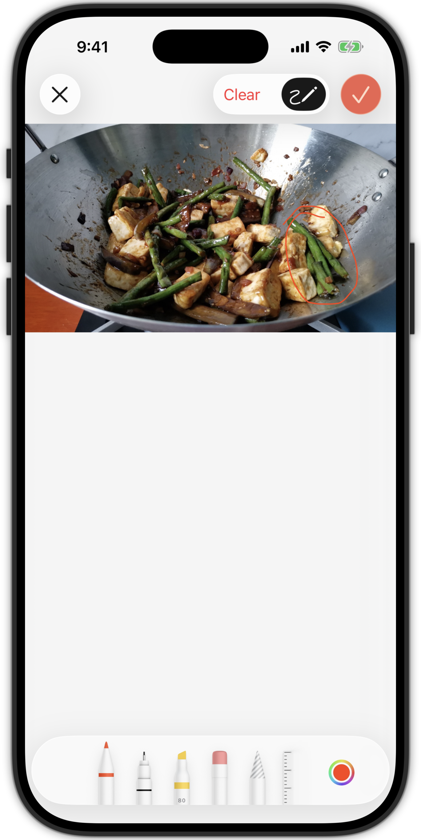 Additionally, tapping on an image brings the Drawing Editor for the image. This enables adding markers and labels to the image, which is useful for arrows, hints and covering areas of the image.