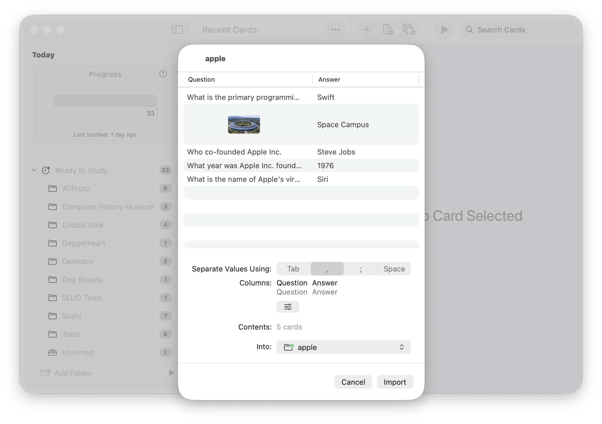Importing from a Benkyo Box archive (.bboxarchive files) restores cards, folders, and their attachments (images and drawings) previously exported from the app. This is useful for restoring backups, moving collections between devices, or sharing cards with others.