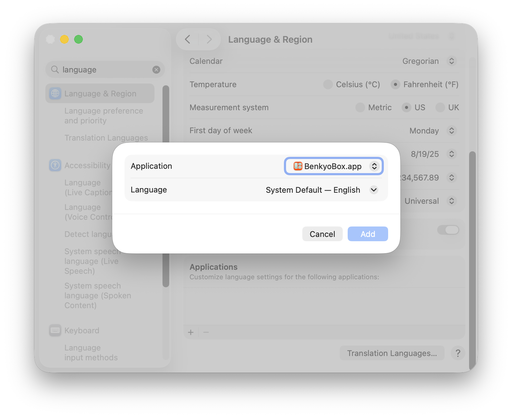 - On Mac Open the system Settings, then go to Language & Region and add Benkyo Box to the list of apps with a different language.